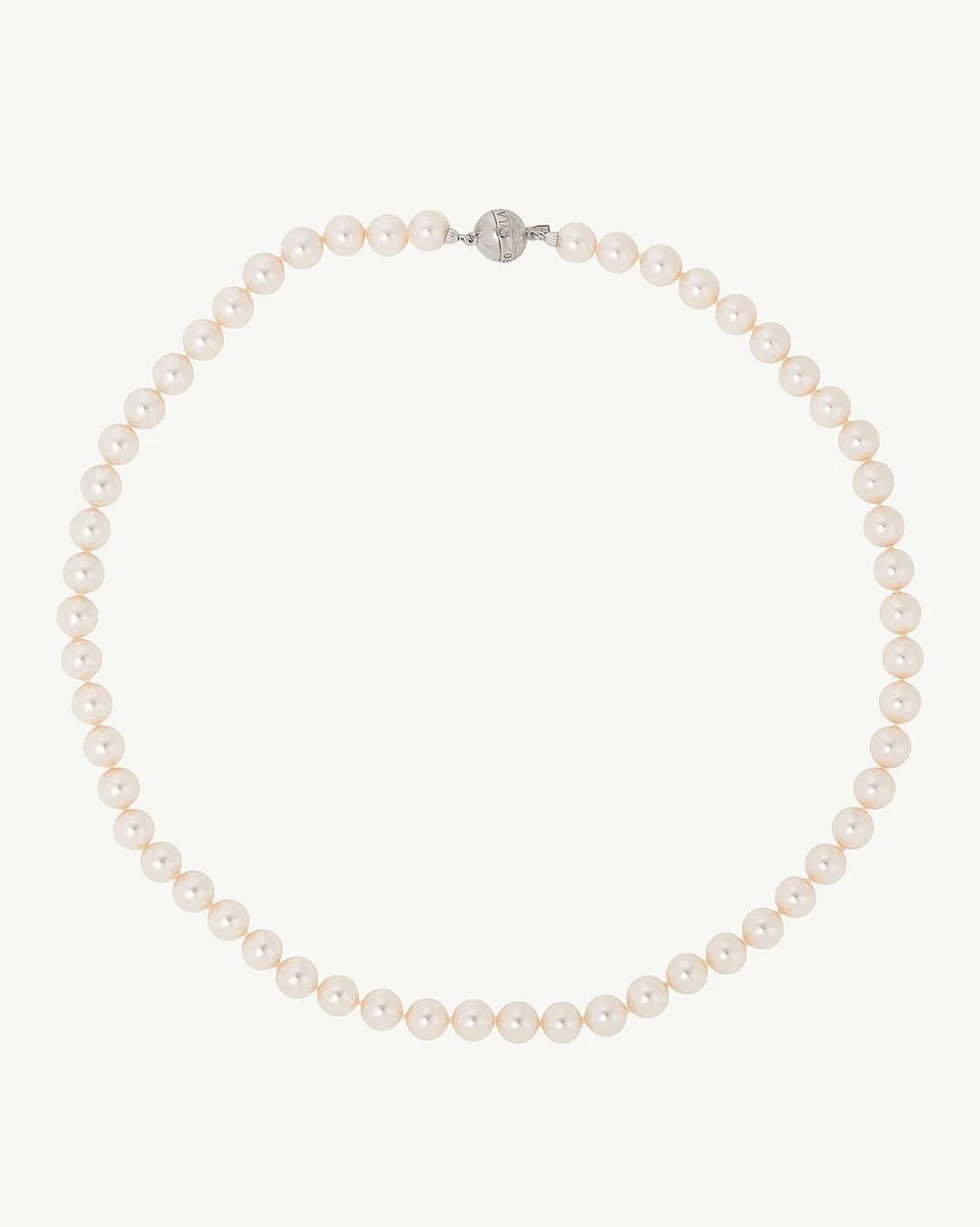Lyra collection necklace featuring 8 mm round white pearls on rhodium-plated silver. A versatile staple for every jewelry box. Discover this classic piece.
