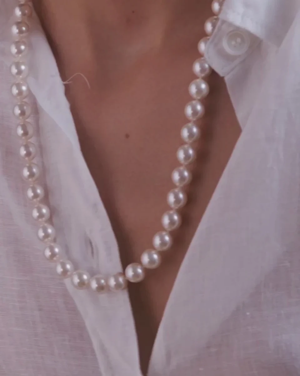 Collier long de 60 cm en argent rhodié orné de perles blanches rondes de 10 mm. Un incontournable de la collection Lyra. Découvrez son éclat.